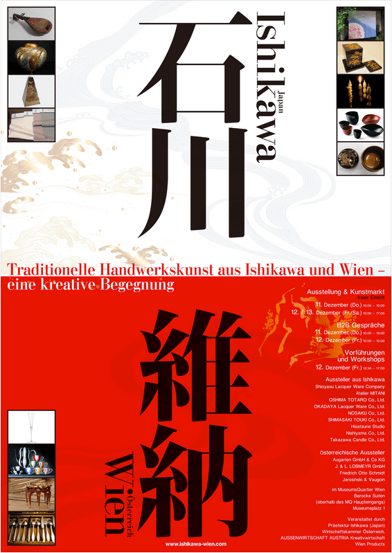 Im Dezember 2014 begrüßte die MEISTERSTRASSE zu der vom Außenwirtschaftscenter Tokio und der Präfektur Ishikawa organisierten Ausstellung von japanischem und österreichischem Kunsthandwerk in die barocken Suiten des Museumsquartiers in Wien. In diesem Zusammenhang wurden auch handwerkliche Schätze der Mitgliedsbetriebe J.&L. Lobmeyr und Augarten Porzellan gezeigt.
